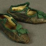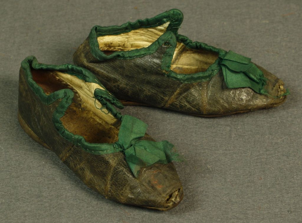 Abbildung: 1 Paar flache Kinderschuhe aus grün-braunem Leder mit angeschnittenen Ristlaschen, die zwei kleine Löcher aufweisen, durch die vermutlich ursprünglich ein Seidenbändchen gezogen wurde. Denkbar ist auch ein Verschluss mit Knopf und Öse. Gefüttert mit weißem, weichem Leder (Glacé), Innensohle extra und Fersenverstärkung aus braunem, festem Leder, mit Überwendlichstich eingenäht. Ausschnittkante und Ristlasche mit grünem Seidenpaspel eingefasst, Seidenschleife aus demselbem Taft auf dem Rist angebracht.