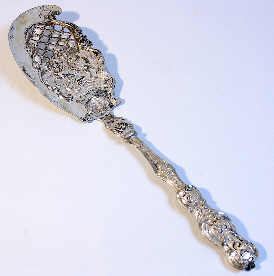 Abbildung: Ein Fischheber mit seitlicher Schneide, wenig Reste einer alten Bemalung erhalten, Am Griff ornamentale Verzierungen, Hebefläche Durchbrechungen, graviert mit Darstellung des Heiligen St. Georg auf Pferd, der gerade den unter ihm sich windenden Drachen die Lanze in das Maul stößt. Auf der Unterseite eingestanzter Meisterstempel.