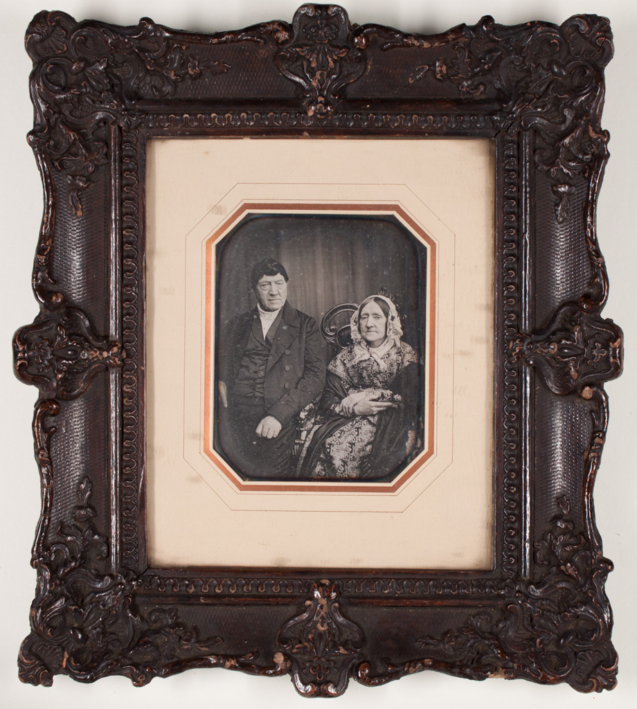 Abbildung: Auf der Rückseite ist folgender Vermerk zu lesen: “Daguerreotyp / von / Stelzner / Portraitmaler / Jungfernstieg No. 11 / HAMBURG.”, darunter der handschriftliche Vermerk: “August 31/47″. Darunter ist ein weiteres Papieretikett mit einem handschriftlichen Vermerk aufgeklebt: “Friedrich Gerhard Harbers. Kaufmann. geb. Oldenburg 1772. Aug. 1. gest. St. Georg 1858. Aug. 5. / Magdala Johanna Henriette geb. Kolthoff geb. Hamburg 1781 März 7. gest. Hamburg 1862 März 7.”